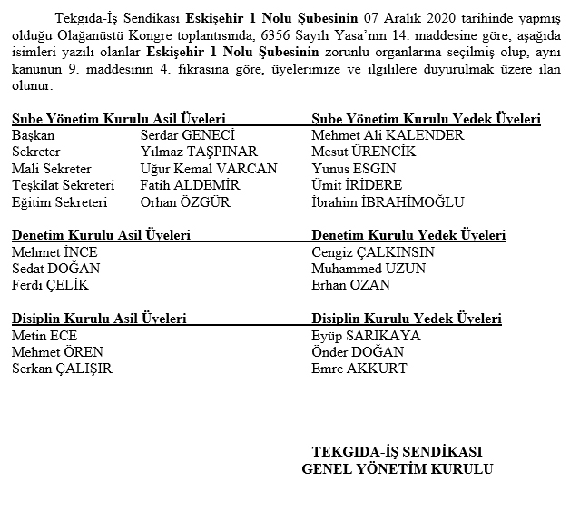 TEKGIDA-İŞ SENDİKASI ESKİŞEHİR 1 NOLU ŞUBESİNİN OLAĞANÜSTÜ KONGRE SEÇİM SONUÇ İLANI