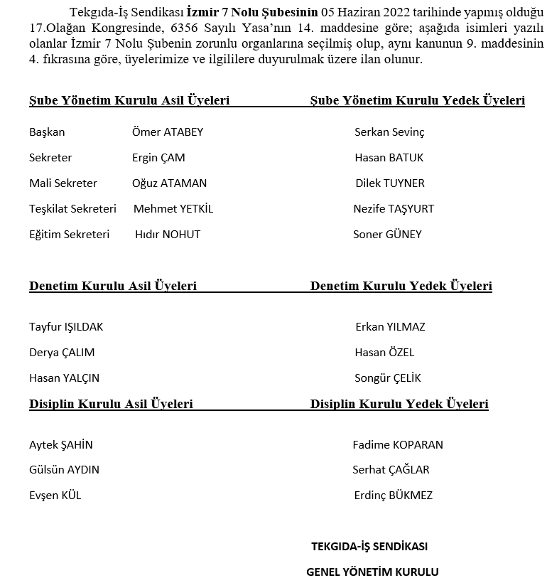 TEKGIDA-İŞ SENDİKASI İZMİR 7 NOLU ŞUBESİ KONGRE SEÇİM SONUÇ İLANI