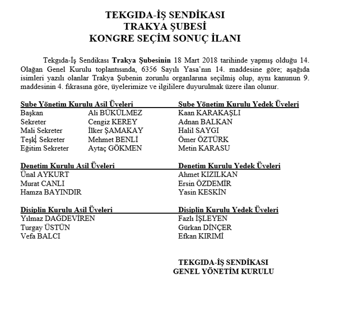 TEKGIDA-İŞ SENDİKASI TRAKYA ŞUBESİ KONGRE SEÇİM SONUÇ İLANI