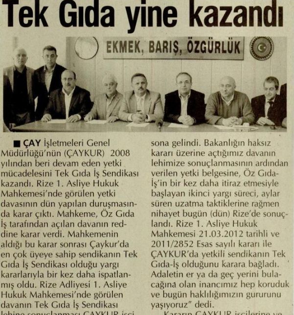 ÇAY İşletmeleri Genel Müdürlüğü´nün (ÇAYKUR) 2008 yılından beri devam eden yetki mücadelesini Tekgıda-İş Sendikası kazandı. Rize 1. Asliye Hukuk Mahkemesi´nde görülen yetki davasının dün yapılan duruşmasında karar çıktı. Mahkeme, Öz Gıda İş tarafından açılan davanın reddine karar verdi.Mahkemenin aldığı bu karar sonrası Çaykur´da en çok üyeye sahip sendikanın Tekgıda-İş Sendikası olduğu yargı kararlarıyla bir kez daha ispatlanmış oldu.