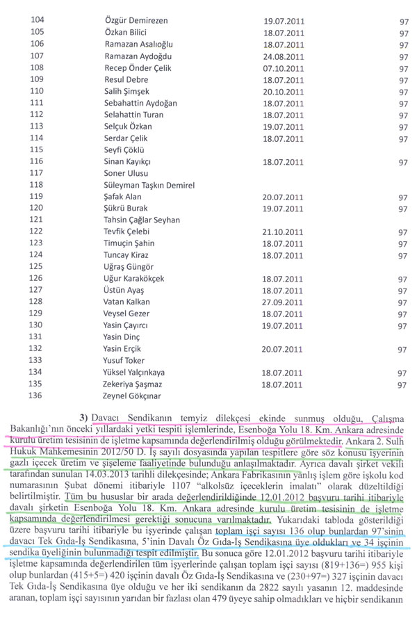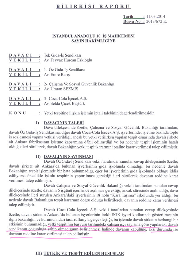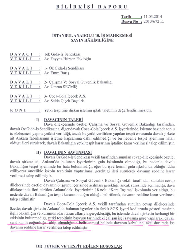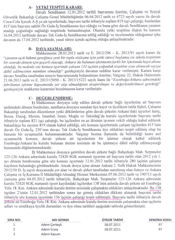Hatırlanacağı üzere, Çalışma ve Sosyal Güvenlik Bakanlığı, Öz Gıda-İş Sendikası’nın başvuru yaptığı tarihte Coca Cola İçecek A.Ş.’ye ait Ankara’da faaliyet gösteren iki üretim işletmesini çoğunluk hesabına katmamış ve böylelikle şirket çalışan sayısını düşük göstererek, çoğunluğu olmadığı halde Öz Gıda-İş Sendikası’nı yetkili saymıştı.