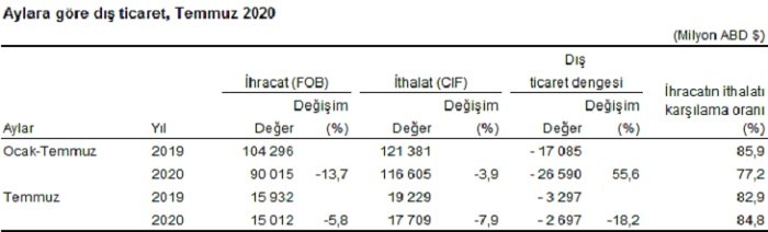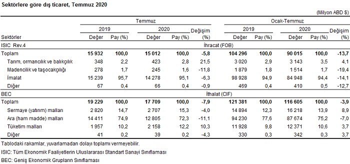 TÜİK ile Ticaret Bakanlığı işbirliğiyle oluşturulan genel ticaret sistemi kapsamında üretilen geçici dış ticaret verilerine göre; ihracat 2020 yılı Temmuz ayında, bir önceki yılın aynı ayına göre %5,8 azalarak 15 milyar 12 milyon dolar, ithalat %7,9 azalarak 17 milyar 709 milyon dolar olarak gerçekleşti.