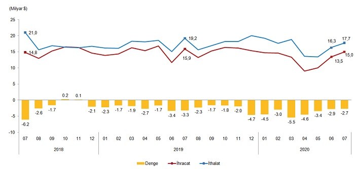 Ocak-Temmuz döneminde dış ticaret açığı %46,5 artarak 18 milyar 105 milyon dolardan, 26 milyar 528 milyon dolara yükseldi. İhracatın ithalatı karşılama oranı 2019 Ocak-Temmuz döneminde %84,5 iken, 2020 yılının aynı döneminde %76,2’ye geriledi.