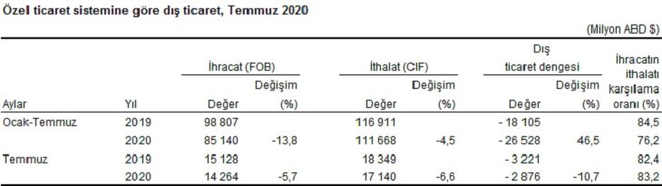 Özel ticaret sistemine göre ihracat, 2020 yılı Temmuz ayında, bir önceki yılın aynı ayına göre %5,7 azalarak 14 milyar 264 milyon dolar, ithalat %6,6 azalarak 17 milyar 140 milyon dolar olarak gerçekleşti.