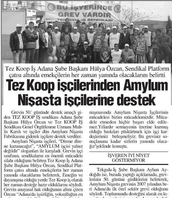 Tekgıda-İş Şube Başkanı Ayhan Aydoğdu ise, burada yaptığı açıklamada, grevlerinin 50. gününe girdiklerini belirterek Amylum Nişasta grevinin 2007 yılından beri Adana’da ilk özel sektör grevi olduğunu söyledi. Toplumunda desteğini alarak en kısa sürede grevlerini sonuçlandırmayı hedeflediklerini söyleyen Aydoğdu, Amylum Nişasta yöneticilerinin grevde bulunan işçilerin evlerine mektup gönderdiklerini belırterekişveren ne yaparsa yapsın bir tane arkadaşımız daha iş başı yapmadıkları sürece bu grevimiz devam edecektir"şeklinde konuştu