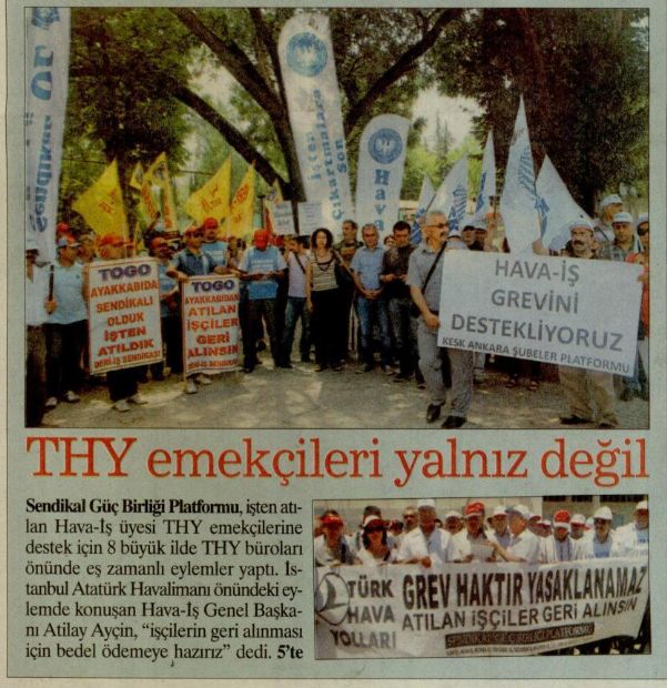 Sendikal Güç Birliği Platformu, işten atılan Hava-İş üyesi THY emekçilerine destek amaçlı, İstanbul’da Atatürk Havalimanı’nda, Ankara, Bursa, İzmir, Mersin, Adana; Antalya ve Gaziantep’te ise THY büroları önünde eş zamanlı eylemler yaptı.