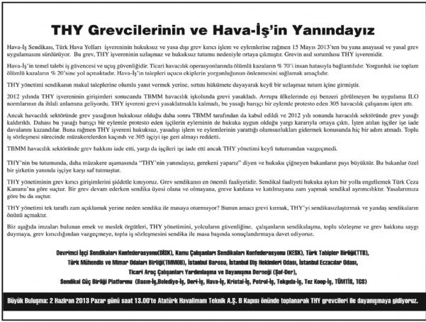 Devrimci İşçi Sendikaları Konfederasyonu(DİSK), Kamu Çalışanları Sendikaları Konfederasyonu (KESK), Türk Tabipler Birliği(TTB), Türk Mühendis ve Mimar Odaları Birliği(TMMOB), İstanbul Barosu, İstanbul Diş Hekimleri Odası, İstanbul Eczacılar Odası, Ticari Araç Çalışanları Yardımlaşma ve Dayanışma Derneği (Şof-Der), Sendikal Güç Birliği Platformu (Basın-İş,BeIediye-İş, Deri-İş, Hava-İş, Kristal-İş, Petrol-İş, Tekgıda-İş, Tez Koop-İş, TÜMTİS, TGS) Büyük Buluşma: 2 Haziran 2013 Pazar günü saat 13.00’te Atatürk Havalimanı Teknik A.Ş. B Kapısı önünde toplanarak THY grevcileri ile dayanışmaya gidiyoruz.