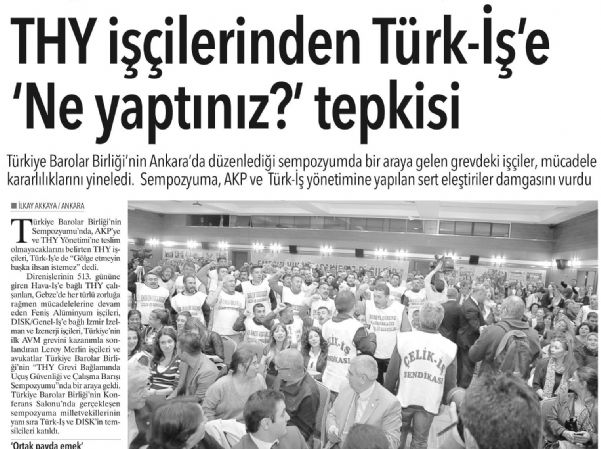Türkiye Barolar Birliği’nin Sempozyumu’nda, AKP’ye ve THY Yönetimi’ne teslim olmayacaklarını belirten THY işçileri, Türk-İş’e de "Gölge etmeyin başka ihsan istemez" dedi. Direnişlerinin 513. gününe giren Hava-İş’e bağlı THY çalışanları, Gebze’de her türlü zorluğa rağmen mücadelelerine devam eden Feniş Alüminyum işçileri, DİSK/Genel-İş’e bağlı İzmir İzelman ve İzenerji işçileri, Türkiye’nin ilk AVM grevini kazanımla sonlandıran Leroy Merlin işçileri ve avukatlar Türkiye Barolar Birliği’nin "THY Grevi Bağlamında Uçuş Güvenliği ve Çalışma Barışı Sempozyumu"nda bir araya geldi.