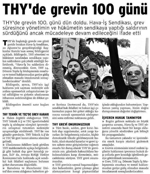 THY’de başlattığı grevde ıoo günü geride bırakan Hava-İş Sendikası, 20 Ağustos’ta gerçekleştirdiği Başkanlar Kurulu’nun sonuç bildirgesini açıkladı. Bildirgede, THY yönetimi ve hükümet tarafından sendikaya yapılan saldırıların çok yönlü sürdüğü belirtilerek, "Hava-İş bu saldırılara direnmiş, direnecektir. Grev, THY 24. Dönem Toplu İş Sözleşmemiz onurluca ve temel haklarımızdan geriye gidiş olmadan masada imzalanarak sonuçlandırılacaktır" denildi.