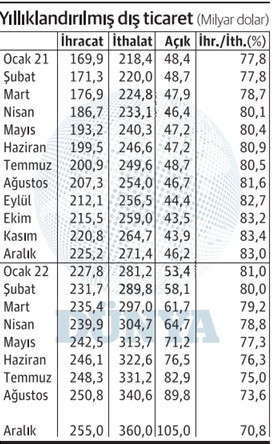 2021 yılı… İhracat 225 milyar, ithalat 271 milyar olmuş ve 46 milyar dolar ticaret açığı verilmiş. 2022 yılıyla birlikte dış ticarete “tılsımlı” bir el değmiş, açık hızla büyümeye başlamış ve kesinleşen son tarih olan ağustos itibarıyla 90 milyarlık açık oluşmuş.