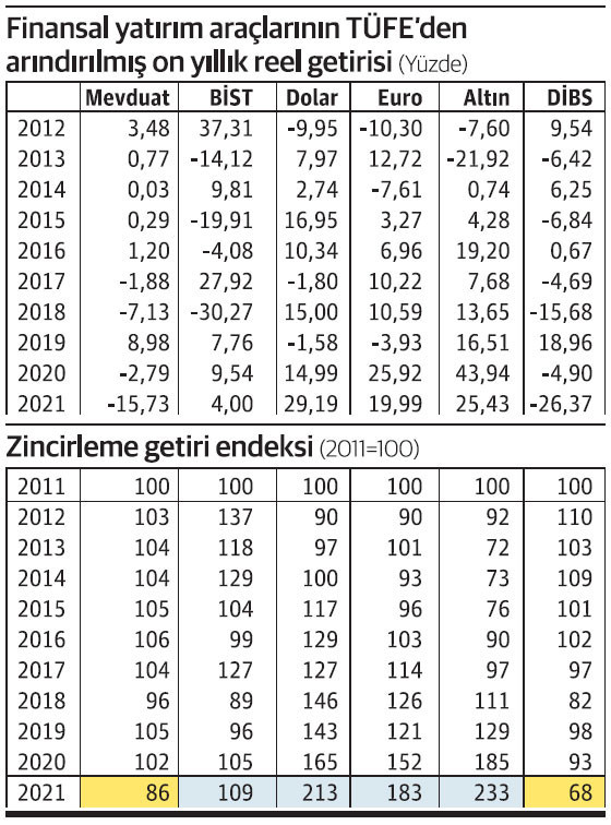 2012-2021 döneminde, yani on yılın toplamında Türk Lirası cinsinden tasarruf edenler cepten yemekten kurtulamadı. Ne TL cinsi mevduat hesabı açtıranlar, ne devlet iç borçlanma senedine yatırım yapanlar enflasyonun üstünde getiri elde edebildi. Bu on yılda mevduatta yüzde 14, DİBS’te yüzde 32 reel kayıp oluştu.