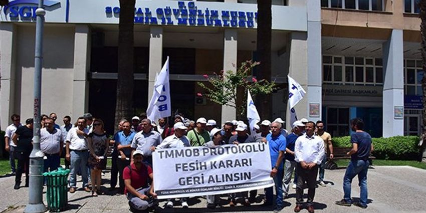 Türk Mimar ve Mühendis Odaları Birliği (TMMOB) ile Sosyal Güvenlik Kurumu (SGK) arasında 2012 yılından beri uygulanan asgari ücret belirleme protokolünün SGK tarafından tek taraflı feshedilmesi üzerine, TMMOB üyeleri dün 20’yi aşkın ilde protesto eylemleri gerçekleştirdi. SGK’ya ve Çalışma Bakanlığı’na ‘bu karardan geri dönme’ çağrısında bulunan TMMOB üyeleri, işlemin geri alınması için mücadele edeceklerini duyurdu.
