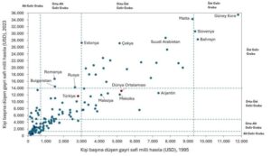 Yağmur Uzunırmak’a göre, Türkiye’nin yakaladığı yüzde 2,91’lik büyüme oranı, dünya ortalamasının biraz üzerinde olsa da, üst gelir grubuna mensup ülkelerle arasındaki farkı kapatabilmesi için yeterli değil. Türkiye, 1960’tan bu yana sadece orta-alt gelir grubundan orta-üst gelir grubuna yükselmeyi başarabilmişken, Estonya, Çekya ve Suudi Arabistan gibi ülkeler, büyüme oranlarıyla üst gelir grubuna geçiş yaptı. 1995-2023 arası dönemde de, Türkiye’nin bu dönüşümü sağlayamaması, ekonomik yapısının hala zorluklarla karşı karşıya olduğunu gösteriyor.