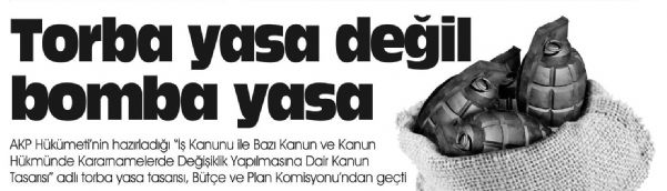 AKP hükümeti hazırladığı Torba Yasa ile önündeki engellerin bir kısmından daha kurtulmaya hazırlanıyor. "İş Kanunu ile Bazı Kanun ve Kanun Hükmünde Kararnamelerde Değişiklik Yapılmasına Dair Kanun Tasarısı" adlı torba yasa tasarısı, Bütçe ve Plan Komisyonu’ndan geçti.