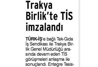 TÜRK-İŞ’e bağlı Tekgıda İş Sendikası ile Trakya Birlik Genel Müdürlüğü arasında devam eden TİS görüşmeleri anlaşma ile sonuçlandı.