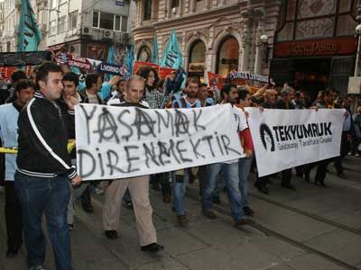 İstanbul ve İzmir’de ki direnişinin çadırlarında 162 işçinin işe dönem direnişi sürerken ,patronların sorunun çözümü için hiç bir adım atmaya yanaşmamasına tepki Taksim’den geldi.UPS işçilerinin işe geri alınması ve sendika haklarına engellemesi önünde ki engellerin derhal kaldırılması için tek yumruk olan siyasi partiler,demokratik kitle örgütleri,sosyalist kurumlar,sendikalar,Futbol taraftarlarından oluşan yüzlerce insan Galatasaray Meydanı’ndan Taksim Tramvay Durağına yürüdüler.” UPS işçisi yalnız değildir”,”Gün gelecek devran dönecek AKP halka hesap verecek”,” Zafer direnen emekçinin olacak” sloganlarını atan yüzlerce insan, Başbakan Erdoğan’ın yeni Anayasada herkesin 2 sendikaya üye olabileceğini söylerken bir UPS işçileri gibi yüzlerce işçinin sadece bir sendikaya üye oldukları için işten çıkartıldığını hatırlatarak, bu iki yüzlüğün derhal son bulmasını istediler.