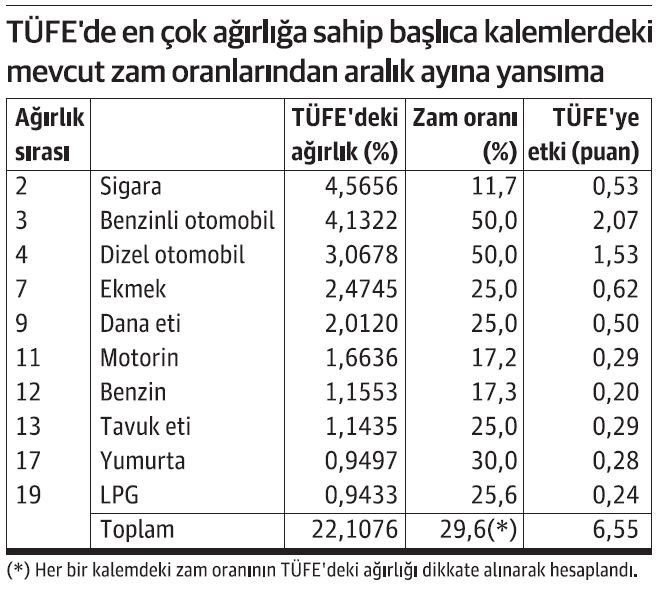 Toplam TÜFE’deki ağırlığı yüzde 22 olan bu on kalemdeki zamlardan TÜFE’ye yansıma yüzde 6.55 düzeyinde.