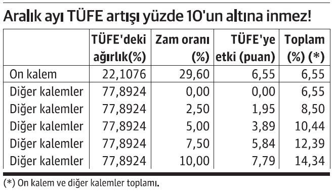 Diğer kalemlerdeki ortalama zam oranının yüzde 5 düzeyinde gerçekleşmesi, aralık ayı TÜFE artışının çift haneye ulaşması demek. Bu durumda aralık ayı artışı yüzde 10.44 olacak.