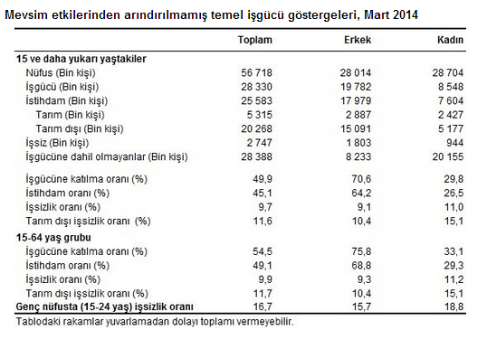 Türkiye genelinde 15 ve daha yukarı yaştakilerde işsiz sayısı 2014 yılı Mart döneminde 2 milyon 747 bin kişi oldu. İşsizlik oranı ise %9,7 seviyesinde gerçekleşti. İşsizlik oranı erkeklerde %9,1, kadınlarda ise %11 oldu. Aynı dönemde; tarım dışı işsizlik oranı %11,6 olarak tahmin edildi. 15-24 yaş grubunu içeren genç işsizlik oranı %16,7 iken,15-64 yaş grubunda bu oran %9,9 olarak gerçekleşti.