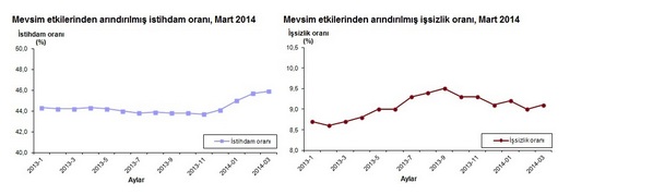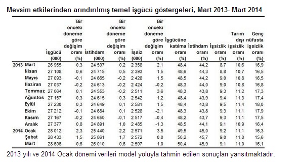 Mevsim etkilerinden arındırılmış işsizlerin sayısında 2014 yılı Mart döneminde, bir önceki döneme göre 25 bin kişilik artış gerçekleşti. İşsizlik oranı ise 0,1 puanlık artış ile %9,1 oldu.