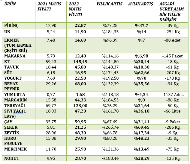 2021 Mayıs ve 2022 Mayıs ayları kıyaslandığında 2 bin 825 TL asgari ücret, bu yıl yüzde 50 artışla 4 bin 253 TL olan asgari ücretin alım gücü olarak üstünde kaldı. Asgari ücret geçen yıla göre yüzde 50 oranında artarken son bir yılda patatesin fiyatı yüzde 358, kuru soğanın fiyatı ise yüzde 359 oranında arttı. Tüm ekmek çeşitlerinin fiyatı yüzde 96 oranında artarken etin fiyatı yıllık yüzde 144 ve tavuğun fiyatı ise yıllık yüzde 148 oranında arttı. Bakliyat ürünlerinde ise nohutun fiyatı yüzde 188, mercimeğin fiyatı yüzde 121 ve kuru fasulyenin fiyatı ise son bir yılda en az yüzde 88 arttı. Asgari ücretli en büyük kaybı ise geçmiş yıla göre bin 137 adet kayıpla yumurta ve bin 15 kilo kayıpla kuru soğanda yaşadı.”