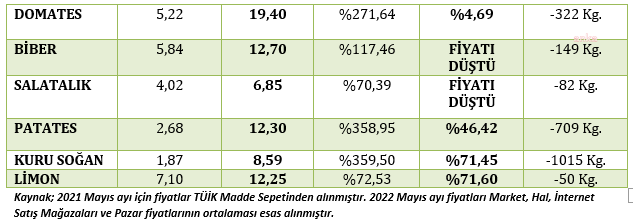 “Mayıs ayı içerisinde market, pazar ve internet satış mağazalarında yapılan fiyat derlemelerine göre pirinçten makarnaya, etten tavuğa, domatesten peynire temel besin maddelerinin hemen hemen hepsinde bir önceki aya göre yaşanan artışlar dikkat çekti. Mayıs ayında bir önceki aya göre sütün fiyatı yüzde 70, kuru soğan ve limonun fiyatı yüzde 71, tavuk etinin fiyatında yüzde 62 ve etin fiyatında ise yüzde 30’luk artış meydana geldi. Aylık artışlar şekerde yüzde 69 ve beyaz peynirde yüzde 35 olarak gerçekleşti. Mayıs ayında bir önceki aya göre sadece biber ve salatalığın fiyatı bir önceki aya göre düşerken, diğer temel besin maddelerinin fiyatlarında bir önceki aya göre artış yaşandı.
