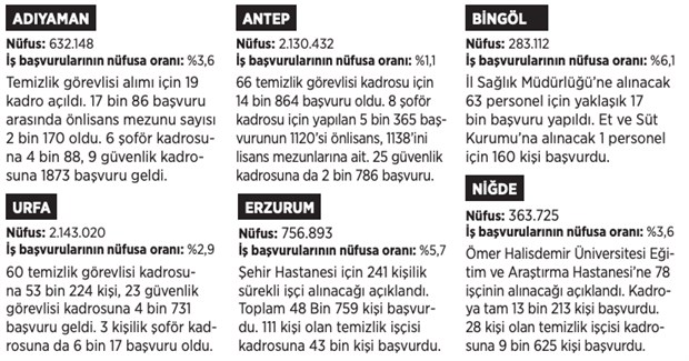 TÜİK verileri işsizliğin azaldığını gösterse de gerçek hayatta işsizlik giderek derinleşen sosyal krize neden oluyor. Kısıtlı sayıda açılan kadrolar için yapılan başvurular kent nüfuslarının yüzde 5’ini dahi aşmış durumda. Son olarak Sağlık Bakanlığı’nın İŞKUR aracılığıyla Türkiye geneli için açtığı ‘sürekli işçi’ kadrosu alımlarına yönelik başvurular şöyle: