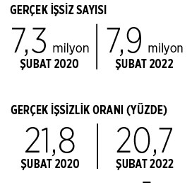 DİSK-AR tarafından yapılan hesaplamaya göre mevsim etkisinden arındırılmış geniş tanımlı işsiz sayısı ise Şubat 2022’de 7 milyon 989 bin kişi olarak gerçekleşti. Pandemi öncesine göre işsiz sayısı 959 bin artmış durumda. Geniş tanımlı işsizlik yüzde 20,7’den yüzde 21,8’e yükseldi. İŞKUR’a kayıtlı işsiz sayısı ile TÜİK verileri arasındaki fark da giderek açılıyor. İŞKUR verilerine göre Şubat 2021 ve Şubat 2022 arasındaki bir yıllık dönemde kayıtlı işsiz sayısı 2 milyon 863 binden 3 milyon 188 bine yükselerek 325 bin kişi arttı.