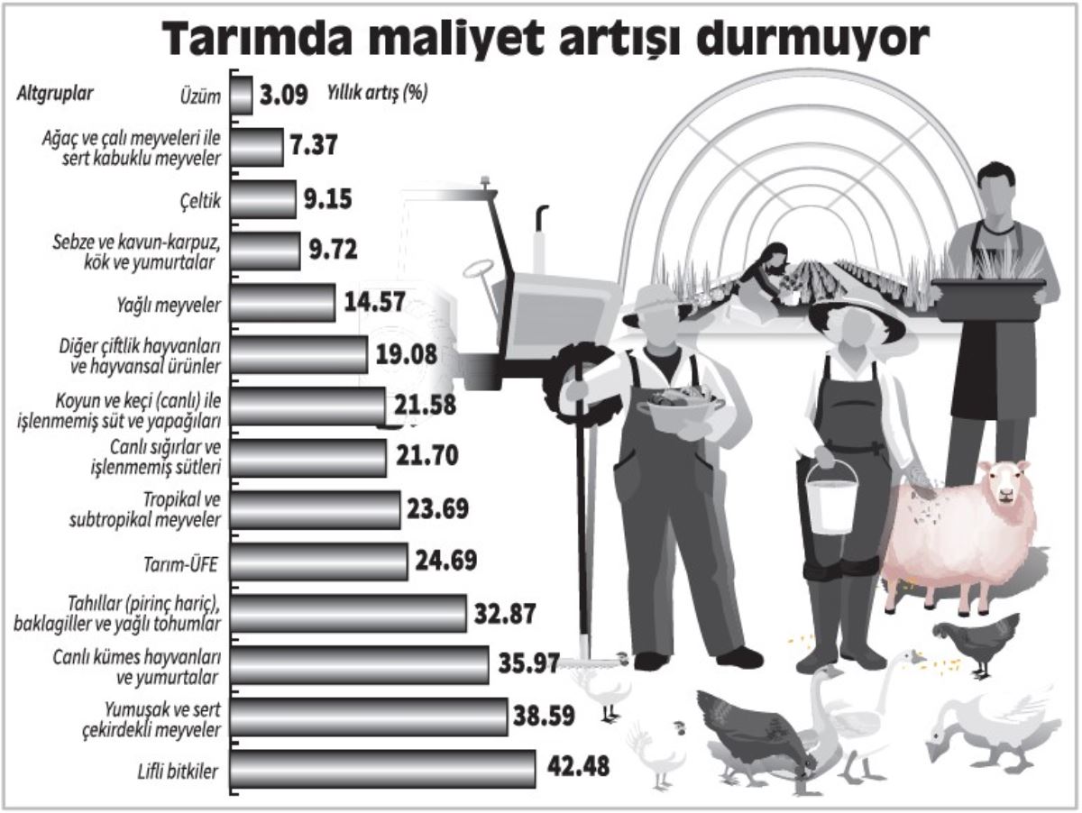 Elektrik, gübre gibi girdilerde yaşanan artış ve kuraklık tarım üretiminde maliyetleri yıllık yüzde 24.69 artırdı. Tarım üreticisi, TÜİK rakamlarının gerçeği yansıtmadığını, hissedilen artışın yüzde 50 olduğunu söylüyor.