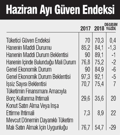 Haziran ayı Tüketici güven endeksi yüzde 70.3 olarak açıklandı. Geçen sene Haziran ayında da aynı seviyede yüzde 70.0 idi.