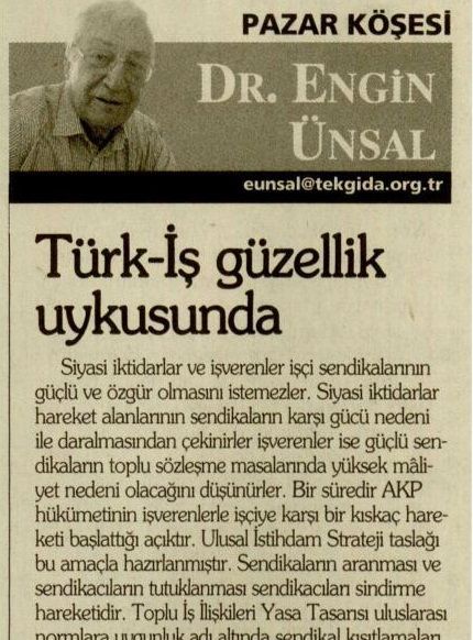 Bir süredir AKP hükümetinin işverenlerle işçiye karşı bir kıskaç hareketi başlattığı açıktır. Ulusal İstihdam Strateji taslağı bu amaçla hazırlanmıştır. Sendikaların aranması ve sendikacılann tutuklanması sendikadan sindirme hareketidir.