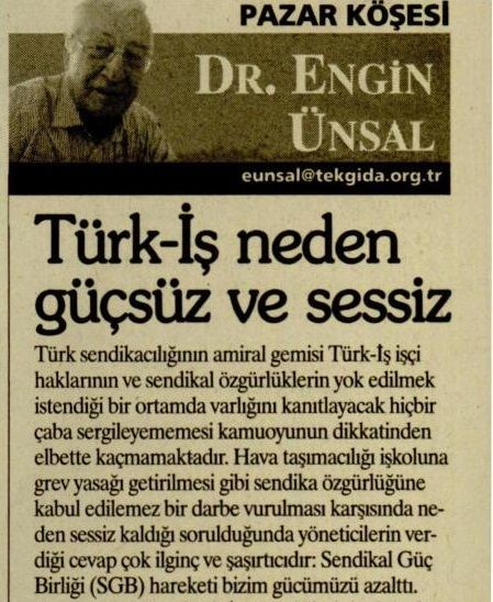 Türk sendikacılığının amiral gemisi Türk-İş işçi haklarının ve sendikal özgürlüklerin yok edilmek istendiği bir ortamda varlığını kanıtlayacak hiçbir çaba sergileyememesi kamuoyunun dikkatinden elbette kaçmamaktadır. Hava taşımacılığı işkoluna grev yasağı getirilmesi gibi sendika özgürlüğüne kabul edilemez bir darbe vurulması karşısında neden sessiz kaldığı sorulduğunda yöneticilerin verdiği cevap çok ilginç ve şaşırtıcıdır: