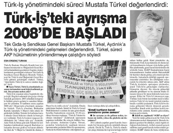 Türk-İş’te yaşanan süreç bugünlerin olayı değil. Bugünü anlamak için geriye dönüp bakmak gerekiyor. 2007 yılındaki kongreyle birlikte göreve gelmiş ve sancıları bitmeyen bir yönetim. O tarihten sonra yapılan 2008 yılı 1 Mayıs’ında yönetimde ayrışmalar başladı. Türk-İş yönetimi, Başkanlar Kurulu kararıyla 1 Mayıs’ı tüm emek örgütleriyle birlikte Taksim’de kutlama kararı almıştı. Genel Sekreter olarak da bana görev verilmişti. Türk-İş bu işten vazgeçer dediklerinde biz "olmaz öyle şey" demiştik. Ama Türk-İş birkaç gün kala Taksim’de kutlamalara katılmaktan vazgeçti. Başbakan ve bakanlar devreye girdi ve bu kararı aldırdılar. Ben de "1 Mayıs’ta Taksim’de oluruz, 2 Mayıs’ta da istifa ederiz" demiştim. Orada çatırdama başladı. Şimdi ki Türk-İş Genel MALİ SEKRETERİ o zaman da aynı görevdeydi. Sendika başkanlarını arayarak, 15-20 sendikayı biraraya toplayıp, "Türk-İş Taksim’de olmayı istemiyor" dedirterek operasyon yapmaya kalktılar. Bu süreçle birlikte başladı ayrışma. Ardından Çaykur, Yorsan, peşinden belediyelerde yapılmak istenen operasyonlar, peşinden Hava-İş operasyonu, bunların herbirini birbirine eklediğinizde gelinen noktayı daha iyi anlayabiliriz.