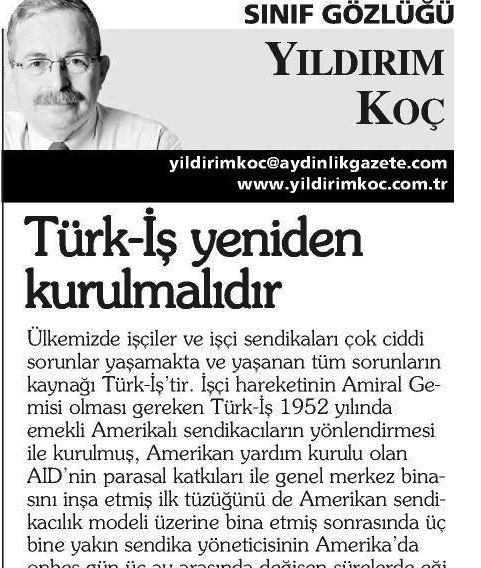 Ülkemizde işçiler ve işçi sendikaları çok ciddi sorunlar yaşamakta ve yaşanan tüm sorunların kaynağı Türk-lş’tir. İşçi hareketinin Amiral Gemisi olması gereken Türk-lş 1952 yılında emekli Amerikalı sendikacıların yönlendirmesi ile kurulmuş, Amerikan yardım kurulu olan AID’nin parasal katkıları ile genel merkez binasını inşa etmiş ilk tüzüğünü de Amerikan sendikacılık modeli üzerine bina etmiş sonrasında üç bine yakın sendika yöneticisinin Amerika’da onbeş gün-üç ay arasında değişen sürelerde eğitilmesini sağlamış ve işçi hareketimizin siyaset dışı bir sendikacılık anlayışı batağında kişiliğini kaybetmesine neden olmuştur.