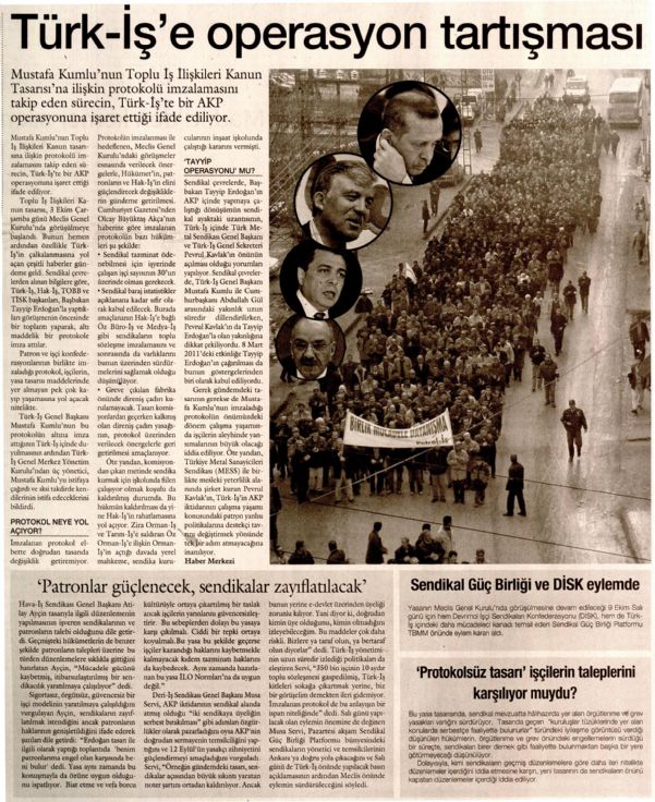 Mustafa Kumlu’nun Toplu İş İlişkileri Kanun tasarısına ilişkin protokolü imzalamasını takip eden sürecin, Türk-İş’te bir AKP operasyonuna işaret ettiği ifade ediliyor. Toplu İş İlişkileri Kanun tasarısı, 3 Ekim Çarşamba günü Meclis Genel Kurulu’nda görüşülmeye başlandı. Bunun hemen ardından özellikle TürkIş’in çalkalanmasına yol açan çeşitli haberler gündeme geldi. Sendikal çevrelerden alınan bilgilere göre, Türk-lş, Hak-Iş, TOBB ve TİSK başkanları, Başbakan Tayyip Erdoğan’la yaptıkları görüşmenin öncesinde bir toplantı yaparak, altı maddelik bir protokole imza attılar.