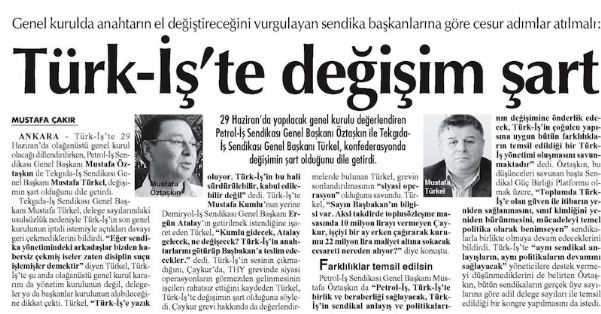 Türk-İş’te 29 Hazıran’da olağanüstü genel kurul olacağı dillendınlirken, Petrol-lş Sendikası Genel Başkanı Mustafa Oztaşkın ile Tekgıda-lş Sendikası Genel Başkanı Mustafa Türkel, değişimin şart olduğunu dile getirdi. Tekgıda-lş Sendikası Genel Başkanı Mustafa Türkel, delege sayılarındaki usulsüzlük nedeniyle Türk-lş’ın son genel kurulunun iptali istemiyle açtıkları davayı geri çekmediklerini bildirdi.