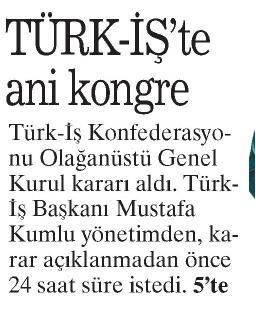 Türk-İş Konfederasyonu yönetimi Olağanüstü Genel Kurul kararı aldı. Türk-İş Başkanı Mustafa Kumlu, yönetimden karar açıklanmadan önce 24 saat süre istedi. Olağanüstü için konuşulan tarih 29 Haziran 2013