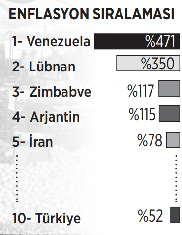 Mayıs ayında en yüksek ikinci gıda enflasyonu yüzde 350 ile Lübnan’da görülürken, Zimbabve yüzde 117 ile üçüncü sırada yer aldı. T24’ün aktardığına göre TÜİK verilerine göre mayıs ayında gıda fiyatlarının bir önceki yıla göre yüzde 52 arttığı Türkiye ise kendine 10. sırada yer buldu. İlk 10’u oluşturan diğer ülkeler Arjantin, İran, Surinam, Mısır, Lao ve Sierra Leone oldu.