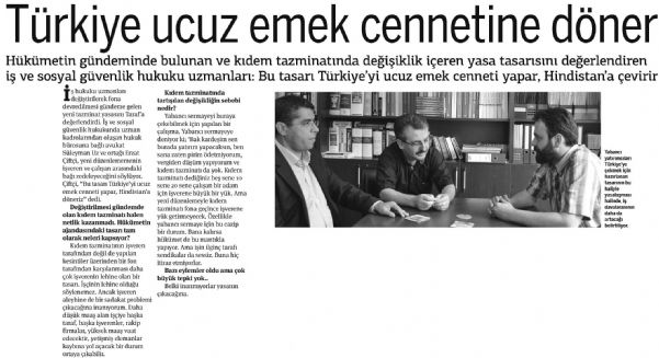 İş hukuku uzmanları değiştirilerek fona devredilmesi gündeme gelen yeni tazminat yasasını Tarafa değerlendirdi. İş ve sosyal güvenlik hukukunda uzman kadrolarından oluşan hukuk bürosuna bağlı avukat Süleyman Uz ve ortağı Erzat Çiftçi, yeni düzenlememenin işveren ve çalışan arasındaki bağı zedeleyeceğini söylüyor. Çiftçi, "Bu tasarı Türkiye’yi ucuz emek cenneti yapar, Hindistan’a döneriz" dedi.