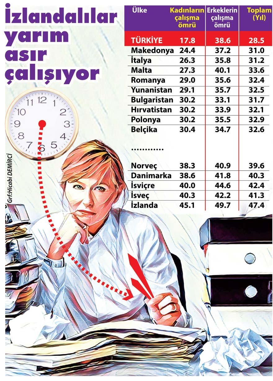 Eurostat’ın son verilerine göre, AB ülkelerinde ortalama çalışma ömrü 35.6 yıla uzarken, Avrupalı kadınların ortalama çalışma ömrü 33.1 yıl olarak hesaplandı. Avrupa’da kadınlar ile erkekler arasındaki çalışma ömrü makası 4.9 yıla geriledi. Bu makasın 2000 yılında 7.2 yıl olduğu hatırlatıldı. Kadınların çalışma ömrünün en kısa olduğu ülke 26.3 yılla İtalya oldu. Sadece Letonya ve Litvanya’da kadınların çalışma ömrünün erkeklerinkinden az farkla uzun olduğu tespit edildi.