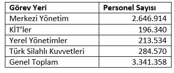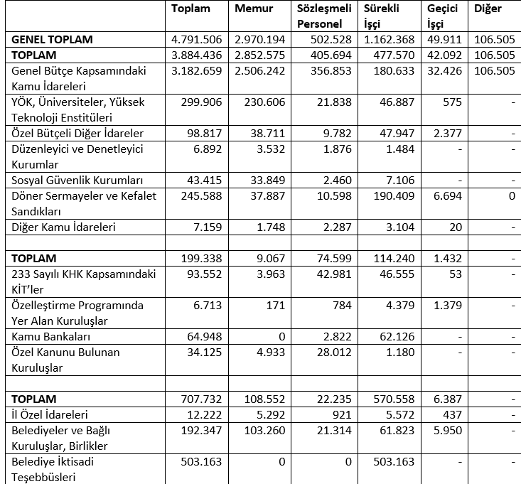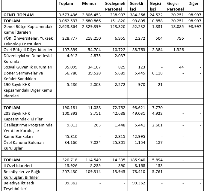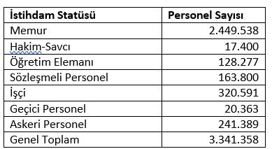 On Birinci Kalkınma Planı, Kamuda İnsan Kaynakları Yönetimi Çalışma Grubu Raporu’na (Kalkınma Bakanlığı, Yay.No: KB:3044-ÖİK:825, Ankara, 2018) göre, 2017 yılında mahalli idareleri da kapsayacak biçimde kamu kesiminde 3.341.358 kişi istihdam ediliyordu. Bu kişilerin istihdam statüsüne göre dağılımları aşağıdaki çizelgede sunulmaktadır: