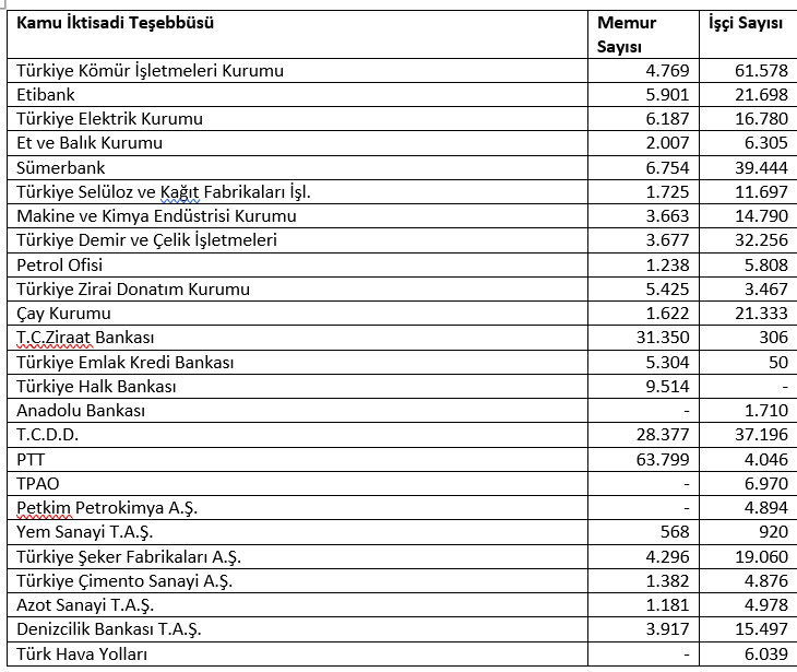 Başbakanlık Yüksek Denetleme Kurulu’nun “Yüksek Denetleme Kurulu’nun Denetimine Giren Kamu İktisadi Teşebbüsleri 1980 Yılı Genel Raporu”na göre (Ankara, 1982, s.63 ve Ek.6), işletmeci KİT’lerde 1980 yılında 386.634 işçi ve 160.737 memur ve teknik personel çalıştırılıyordu. Toplam personel sayısı 547.371 idi. Kamu iktisadi teşebbüslerinde toplam istihdam 603.666 idi. Ancak kamu iktisadi teşebbüslerinin tasfiye edilmesi çabaları ve ardından özelleştirmeler sonrasında bu kamu iktisadi kuruluşlarında kalan toplam personel sayısı 2020 yılı Aralık ayında 190.271 oldu. Bazı kuruluşlarda 1980 yılındaki personel sayıları aşağıda gösterilmektedir: