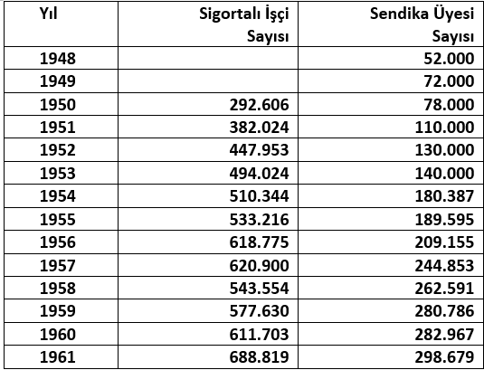 1948-1961 döneminde sendikaların üye sayılarını yüksek göstermelerinin kendilerine getireceği bir yarar yoktu. Zaten sendikalar üye kaydetmekte ve hele aidat toplamakta büyük zorluk yaşıyorlardı. Bu döneme ilişkin sendika üye sayılarının üç aşağı beş yukarı gerçek durumu yansıttığı düşünülebilir. Sendika üye sayıları ile sigortalı işçi sayısını karşılaştırmak yararlıdır.