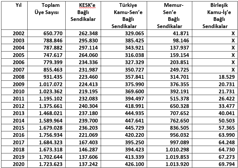 2002-2020 döneminde Türkiye’de kamu çalışanları sendikalarının toplam üye sayıları ile KESK, Türkiye Kamu-Sen, Memur-Sen ve Birleşik Kamu-İş’e bağlı sendikaların toplam üye sayıları aşağıda sunulmaktadır: