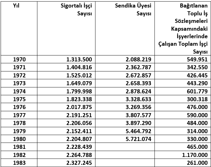 Örneğin, Çalışma ve Sosyal Güvenlik Bakanlığı verilerine göre, 1980 yılında ülkemizdeki sendika üyelerinin sayısı 5,7 milyondu. Ancak aynı yıl sigortalı işçi sayısı 2,2 milyondu. İmzalanan toplu sözleşmeleri kapsamındaki işyerlerinde çalışan toplam işçi sayısı 1979 yılında 314 bin, 1980 yılında 330 bindi. Bu dönemde sonuçlandırılamayan toplu sözleşmeler de vardı. Yüksek Hakem Kurulu’nun sonuçlandırdığı toplu iş sözleşmelerinin kapsamındaki işyerlerinde çalışan toplam işçi sayısı 1982 yılında 1.170.000 ve 1983 yılında 261.000 idi. Bu iki yılın verilerinin toplanmasıyla, toplu sözleşme kapsamındaki işyerlerinde çalışan toplam işçi sayısının 1980 yılında da 1,5 milyon dolaylarında olduğu söylenebilir.