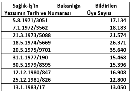 Yıldırım Koç tarafından Çalışma Bakanlığı arşivinde sendikaların dosyaları üzerinde yapılan araştırmada, çeşitli sendikal örgütlerin Çalışma Bakanlığı’na yazdığı yazılarda belirtilen üye sayıları aşağıda sunulmaktadır (Yıldırım Koç, “Türkiye’de Sendika Üyeliği ve Sendikalı İşçiler,” Yeni Gündem Dergisi, 1 Eylül 1985, sayı 29 veya Yıldırım Koç, İşçi Sınıfı ve Sendikacılık Hareketinin Güncel Sorunları, Ataol Yay., İstanbul, 1991, s.20-31):