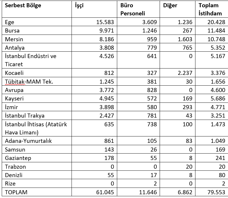 Serbest bölgelerdeki istihdam zaman içinde artmaktadır. Ticaret Bakanlığı verilerine göre, 2009 yılı sonunda toplam istihdam 44.083 iken, 2011 yılı sonunda 54.022 olmuş, istihdam artışı sürerek, 2021 yılı Nisan ayında ise 80.820’e çıkmıştır.