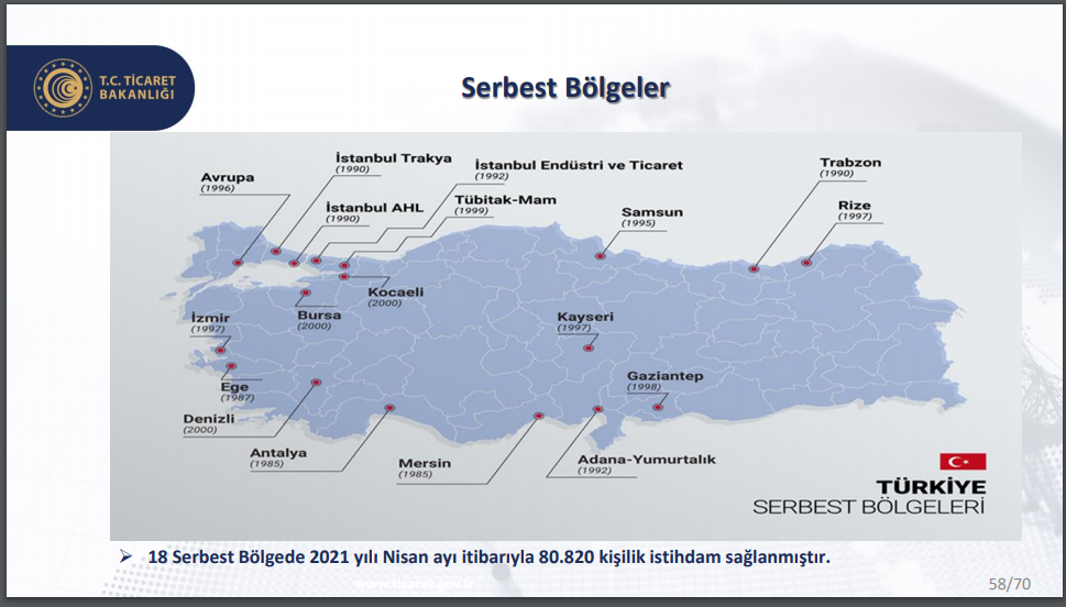 Ticaret Bakanlığı Ekonomik Görünüm Nisan 2021 raporuna göre serbest bölgelerin Türkiye’ye dağılımı aşağıda sunulmaktadır: