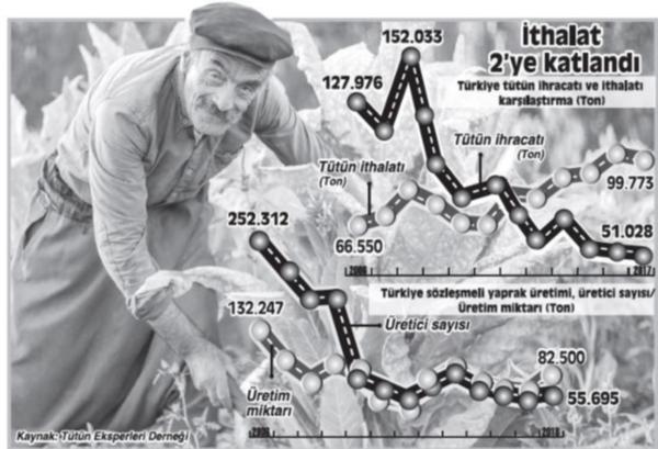 Tütünün, fındık ve üzümden sonra Türkiye’nin en önemli tarımsal ihraç ürünü olduğunun belirtildiği raporda, 2006-2017 aralığında ihracatın değer bazında yüzde 28.9 gerilerken, ithalatın ise yüzde 106.7 yükselmesi dikkat çekti. Raporda, “2006’da 497 milyon dolar olan tütün ihracatı 2017’de 353 milyon dolara; aynı dönem aralığında ithalat ise 253 milyon dolardan 523 milyon dolara çıktı. Yalnızca 2017’de 353 milyon dolarlık ihracata karşılık 522.7 milyon dolarlık tütün ithalatı yapıldı” ifadeleri kullanıldı.
