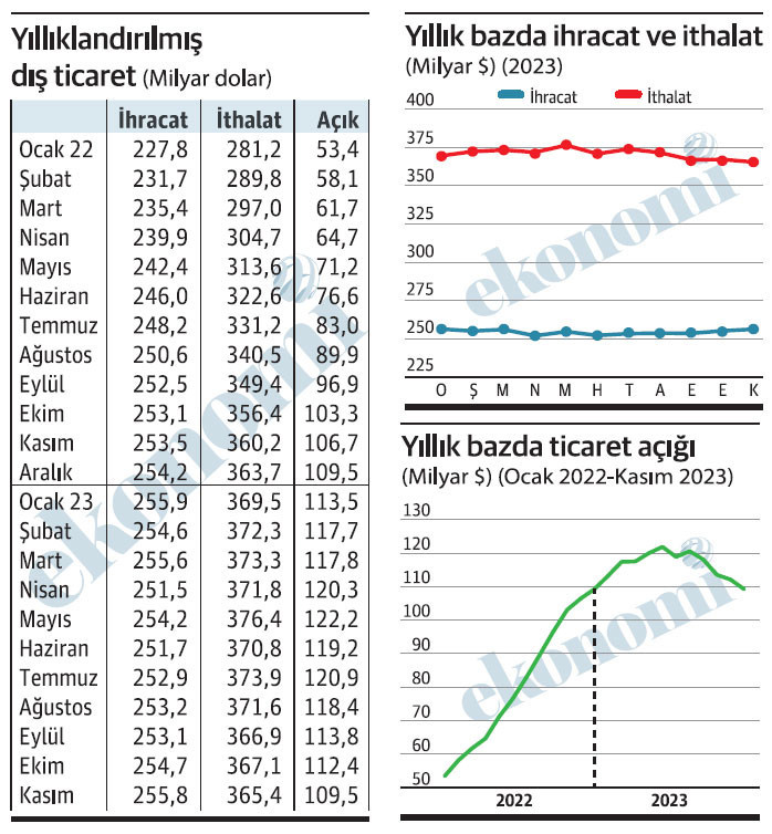Ticaret açığı ocak ayında yıllık bazda 113.5 milyar dolardı. İhracat aynı düzeyde kalıp ithalat bir miktar gerileyince kasım ayındaki yıllık açık da 109.5 milyar dolara indi.